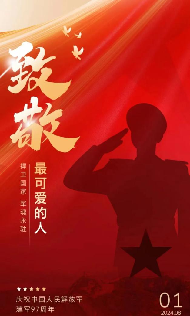 2024年8月1日,中国人民解放军迎来他的97岁生日。我们的军队,在旧中国中破茧成长,在新中国里发展壮大。乘着新时代的浩荡东风,英勇的人民军队在党的旗帜下固建军之本、铸强军之魂,薪火相传,在代代先辈的鲜血中涅槃相承,于世世强军思想的指引下凝聚力量。回顾近百年建军史,人民子弟兵永远冲在第一线。疫情防控,“首战用我,用我必胜”;抢险救灾,“人民有难,军人当先”;率土之滨,“宁将鲜血流尽,不失国土一寸”,他们用坚强的意志,筑起守卫万家灯火的钢铁长城,以易岁月静好,国威浩荡。他们来自人民,是平凡的缩影,服务人民,是伟大的象征。