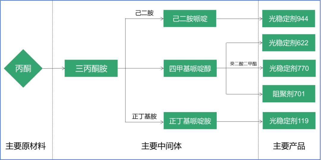 来源:招股说明书化工领域的产业链因为门类庞大,突破又往往是一个个相对小的局点,所以其链条不是“单线”的,有些类似于“跳棋”,有多个分支,有多个选择,有多条路径,三点成面,即可形成一个“根据地”。就是在这样的多条路径与链条中,通过技术攻关,通过建厂扩产能,当前宿迁联盛已经掌握了“丙酮→关键中间体→光稳定剂产品→防老化解决方案”完整产业链条。这些链条上有很多产品成为下一层产品的原材料。总结起来: