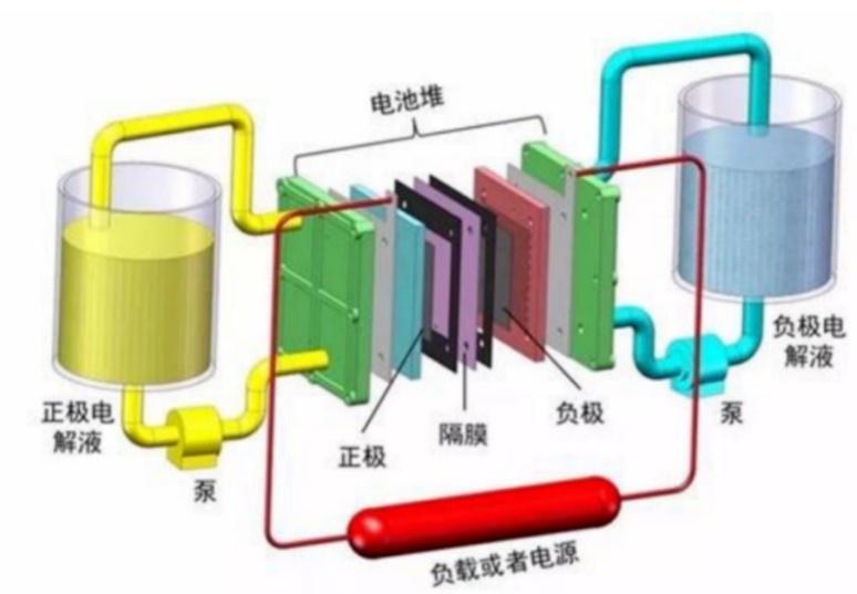 简单而言,液流电池正、负极电解液储罐独立分离,放置在堆栈外部,通过两个循环动力泵将正、负极电解液通过管道泵入液流电池堆栈中,并持续发生电化学反应,通过将化学能与电能进行相互转换作用来完成电能的储存和释放。液流电池功率取决于电极反应面积大小,存储容量则取决于电解液体积与浓度,故液流电池规模大小设计更为灵活多变。