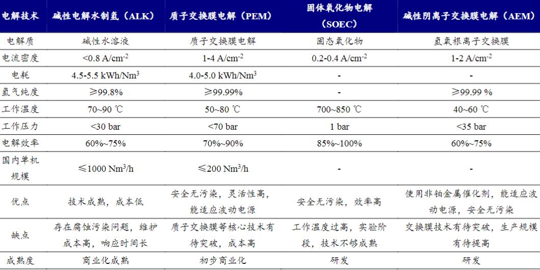图表 10:电解水制氢的四类技术路线对比、各类制氢技术路线对比