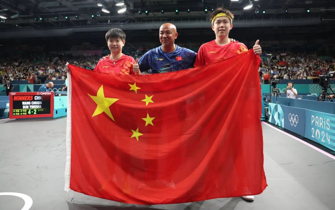 7月30日,王楚钦(右)、孙颖莎(左)和教练肖战在赛后庆祝。刘续摄(新华社)许多现场观众