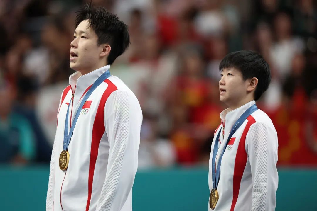 7月30日,冠军中国组合王楚钦(左)/孙颖莎在颁奖仪式上。王东震摄(新华社)这个奥运周期