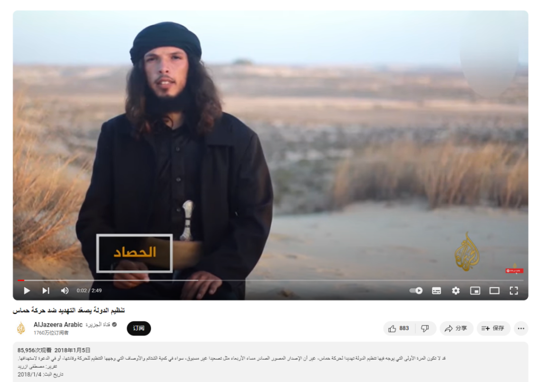 截取相关视频的关键帧进行反搜发现,该视频早在2018年1月已经出现。视频摘自半岛电视台阿拉伯语频道在2018年1月5日发布的报道,画面展示了一名发表讲话的“伊斯兰国”成员,相关素材来自于“伊斯兰国”于2018年1月3日发布的一段视频。报道称,“伊斯兰国”组织因反对哈马斯与埃及当局关系正常化,对哈马斯进行了“前所未有的”威胁。