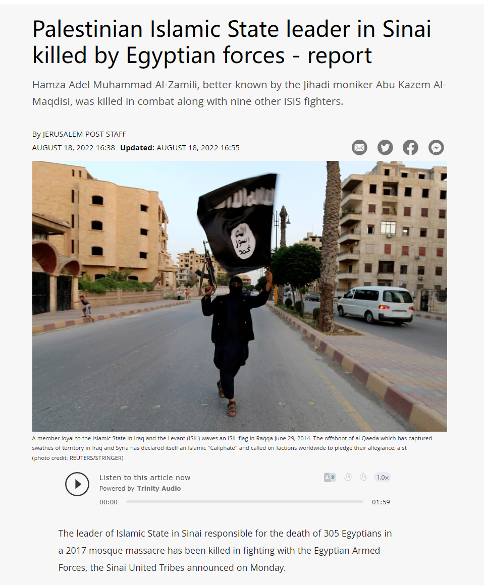 2022年8月18日,据《耶路撒冷邮报》报道,哈姆扎·阿德尔·穆罕默德·扎米利(即马克迪西)在一场与埃及武装部队的战斗中被击毙。报道提到,他对2017年造成305名埃及人死亡的清真寺大屠杀负有责任。