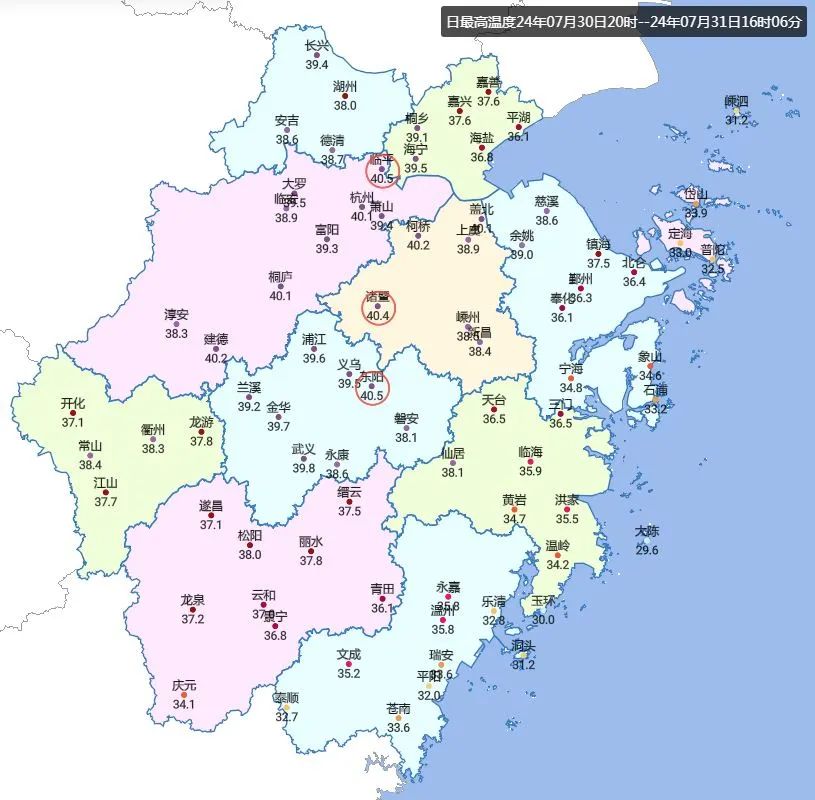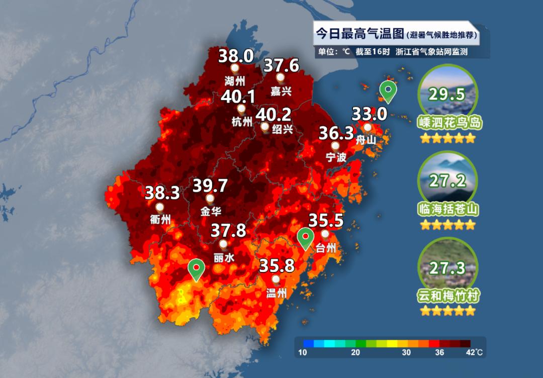 全省高温肆虐,截至16时,共有8个站点最高气温达到了40℃以上,杭州40.1℃,最高为临平和东阳40.5℃,位居并列第一。值得庆幸的是,沿海地区和浙东南部分地区却有一席之地未达到高温线,最高气温在32℃上下,仅有的一方清凉之地,让人羡慕不已。