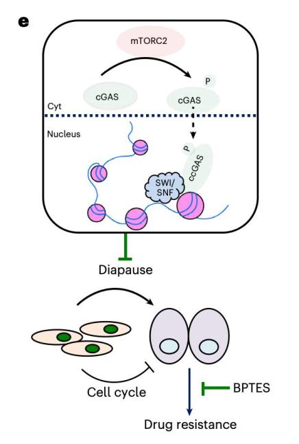 那么,这些难以消灭的“休眠”癌细胞究竟是如何“躲过”化疗药物的攻击的呢?研究团队发现,关键在于一种染色质定位的蛋白——与染色质结合的cGAS(ccGAS)。mTORC2蛋白复合体通过磷酸化一种名为cGAS的小蛋白,促使它结合到染色体上形成ccGAS,进而改变肿瘤细胞的基因表达模式。具体来说,ccGAS会在特定的染色质区域招募SWI/SNF复合物,调节与谷氨酰胺代谢和DNA复制相关的基因,使得这些“休眠”癌细胞获得了对化疗药物的耐受性。