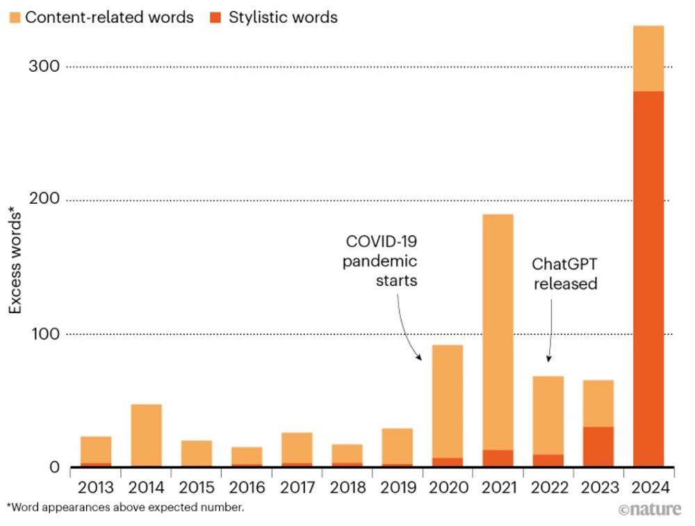 这一研究团队分析了2010年-2024年生物医学领域数据库PubMed中1400万篇论文的摘要,他们发现以ChatGPT为代表的生成式AI工具的出现后,特定修饰性文体词汇的使用量出现异常的激增。研究团队用这些词汇的出现频率估计了使用AI写作的摘要的比例。