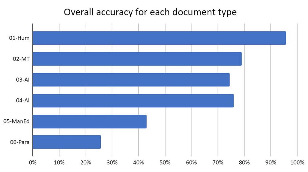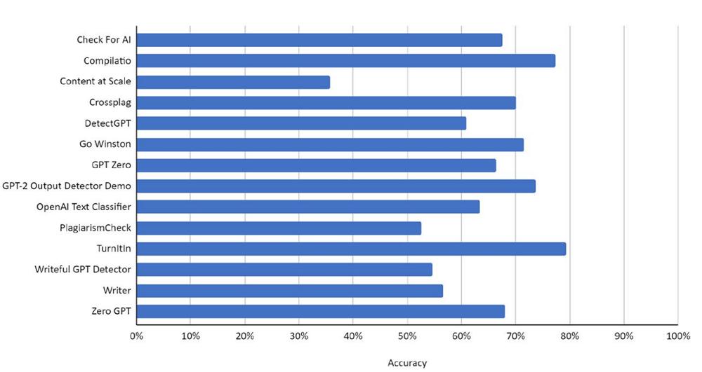 去年年底,德国柏林应用科技大学的几名学者发表研究,他们发现学术界中经常使用的14种AI检测工具中只有5个实现超过70%的正确率。而平均识别正确率仅有50%-60%。