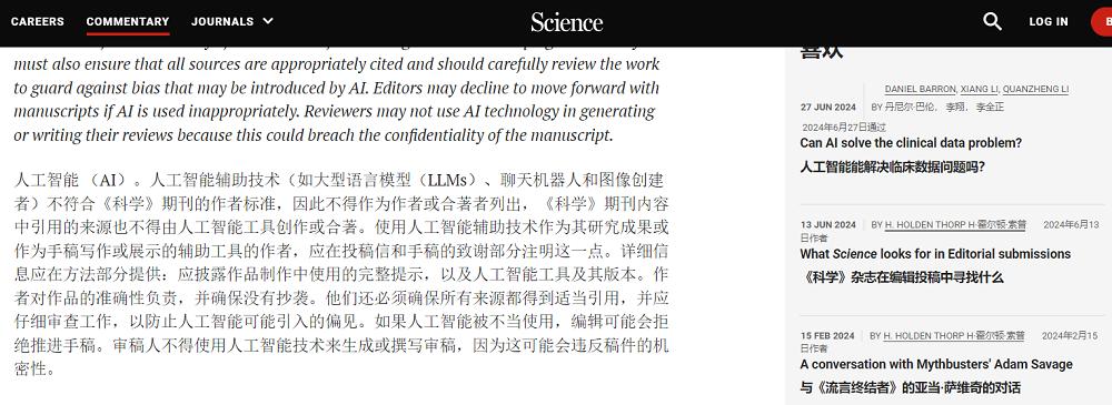 多本期刊也规范了AI工具在学术写作中的使用,并未直接禁止。顶级学术期刊《科学》(Science)规定AI不可被列为合著者,而作者应披露所使用的AI系统和提示词,并对内容准确性和是否涉嫌抄袭负责。