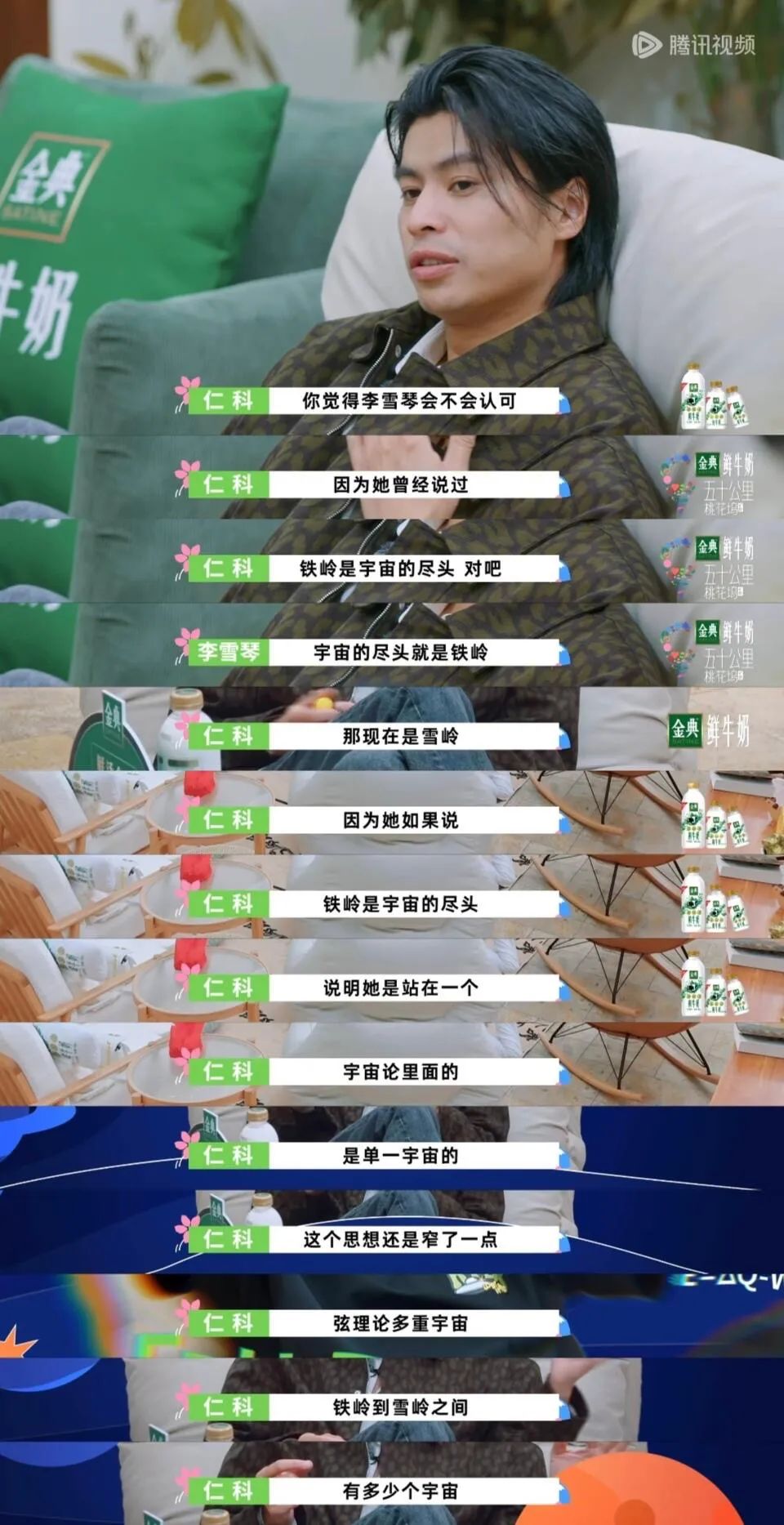 一来就推翻了雪琴的“铁岭宇宙尽头论”,拓宽宇宙边界。到了新老坞民见面的时候,仁科问了李雪琴“铁岭到雪岭之间,隔了多少个宇宙”,雪琴随口说了一个3000,仁科说不对,是一千零一夜,因为我们接下来发生的故事就是一千零一夜的故事。
