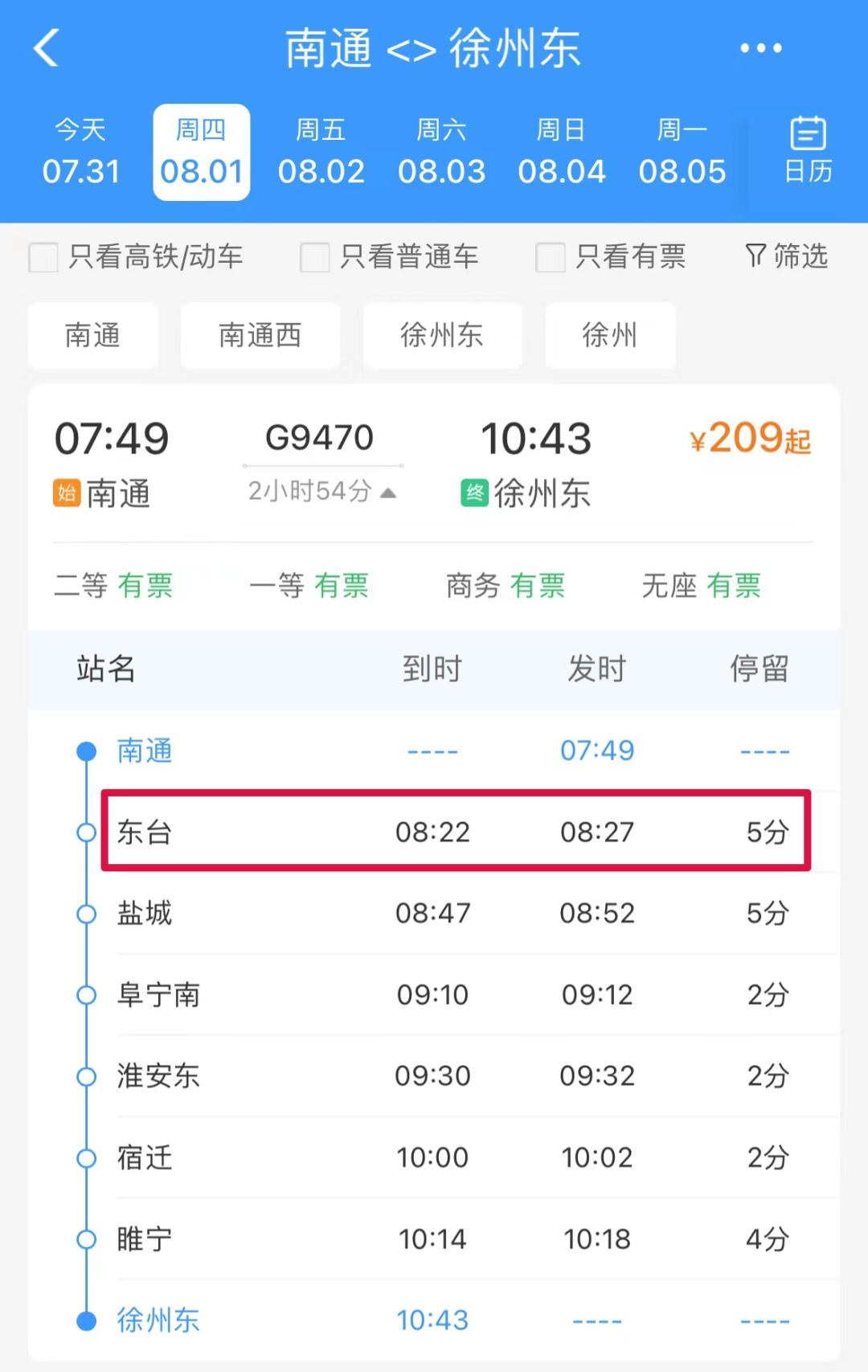 G9470次列车07:49从南通站始发,途经东台、盐城、阜宁南、淮安东、宿迁、睢宁,最后到达徐州东站(10:43到达)。