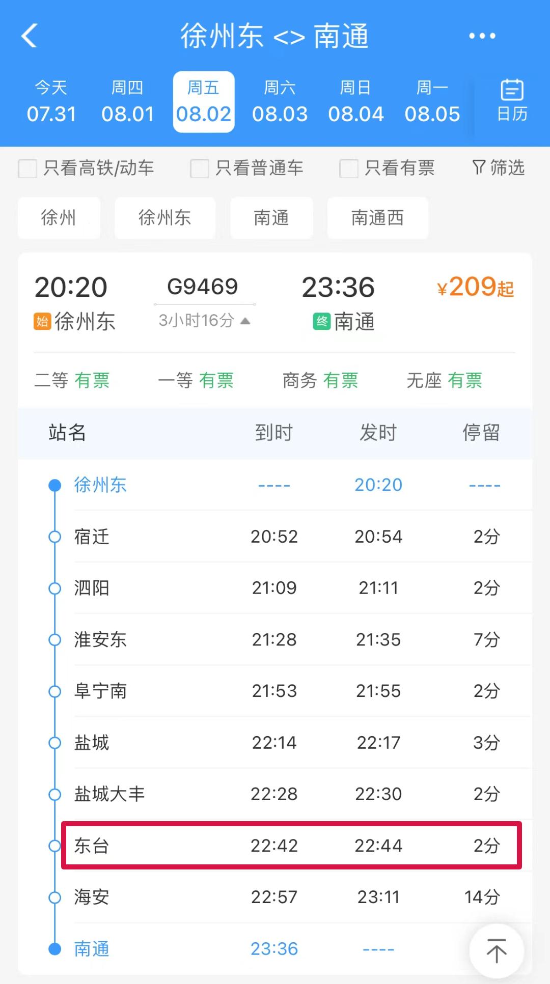 G9469次列车20:20从徐州东站始发,途经宿迁、泗阳、淮安东、阜宁南、盐城、盐城大丰、东台、海安,最后到达南通站(23:36到达)。