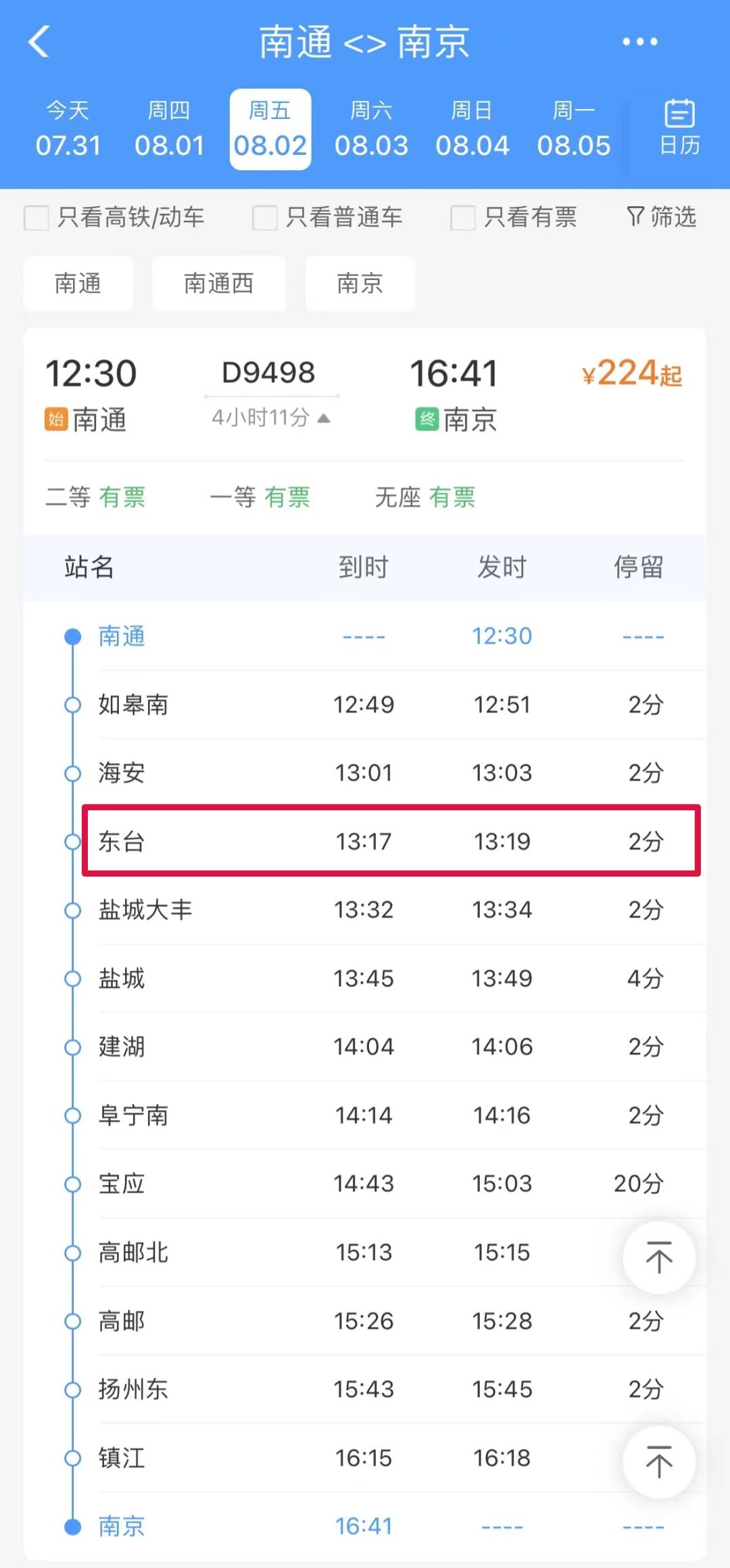 D9498/5次列车12:30从南通站始发,途经如皋南、海安、东台、盐城大丰、盐城、建湖、阜宁南、宝应、高邮北、高邮、扬州东、镇江,最后到达南京站(16:41到达)。