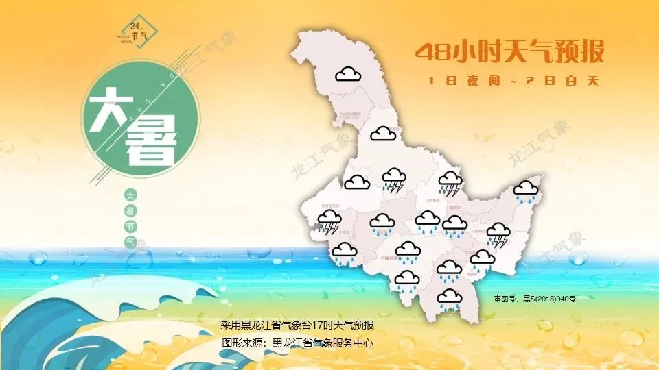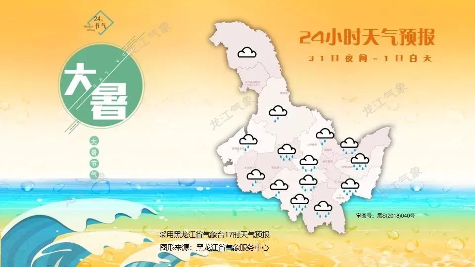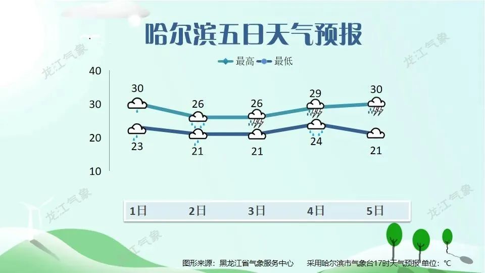 8月1日白天最高气温:大兴安岭24~26℃,大庆、哈尔滨、佳木斯西部、牡丹江29~31℃,其它地区26~28℃。