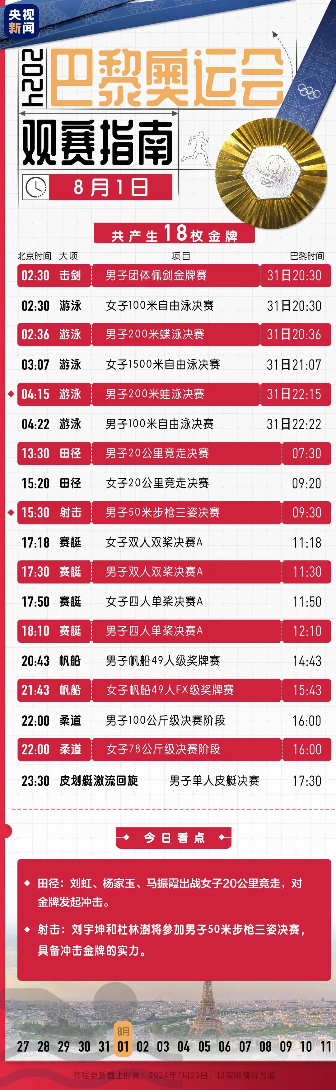 巴黎奥运会第六个比赛日将产生18枚金牌。中国体育代表团将在网球、游泳、田径、赛艇等项目上冲击奖牌甚至金牌。