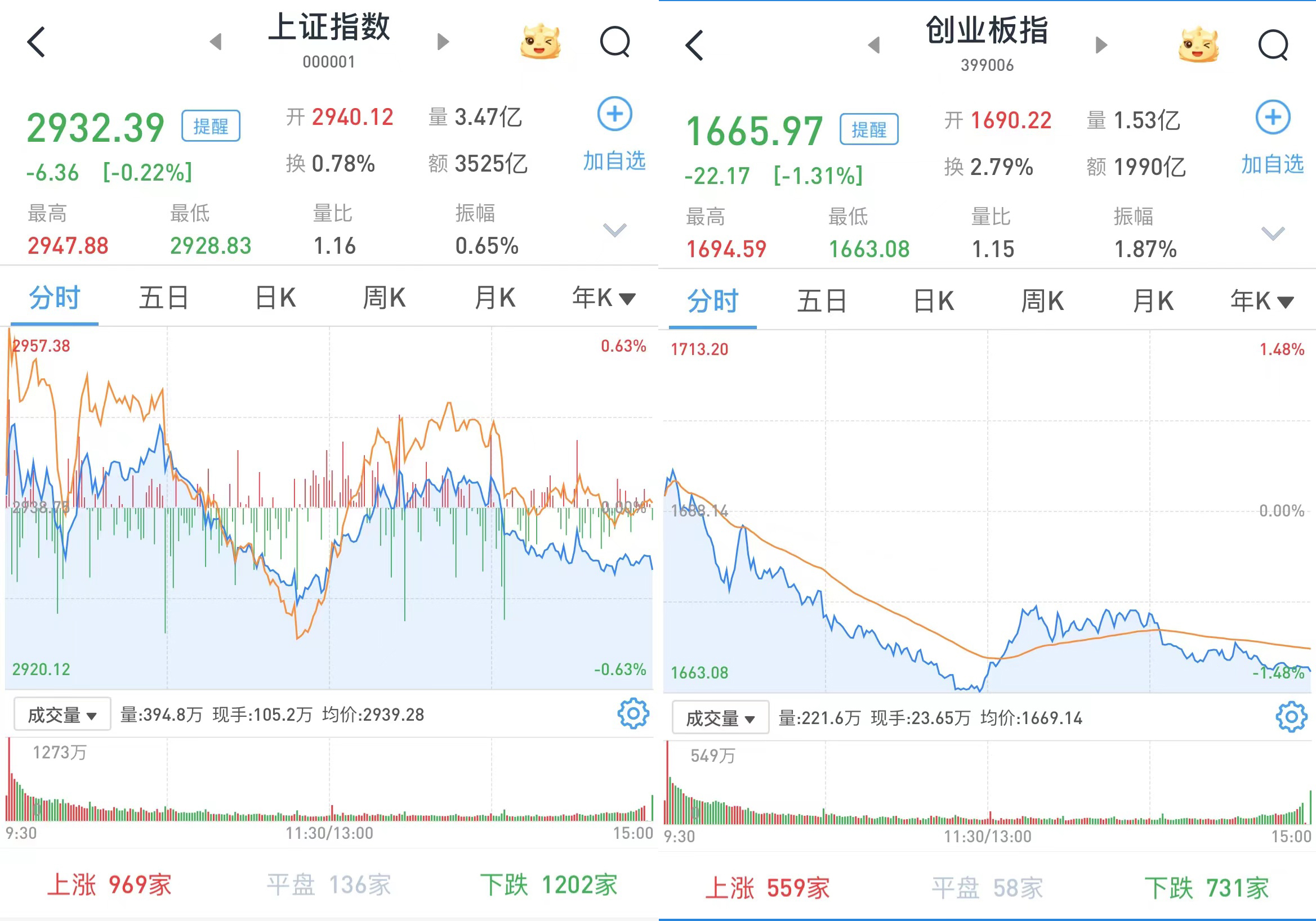至收盘,上证综指跌0.22%,报2932.39点;科创50指数跌0.61%,报738.87点;深证成指跌0.92%,报8673.58点;创业板指1.31%,报1665.97点。