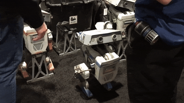 ▲BD-X机器人在迪士尼乐园亮相,画面最右侧的二人为操作员(图源:YouTube)迪士尼的工程师还通过巧妙的设计让机器人能在没有膝盖弯曲执行器的情况下,依赖与地面的接触实现逼真的膝盖弯曲效果。这一机器人配备一块微控制器驱动的通讯板,能以600赫兹的频率实现内置电脑、执行器和惯性测量单元之间的通讯。1块可拆卸电池为机器人供电,能维持至少1个小时的运转时间。