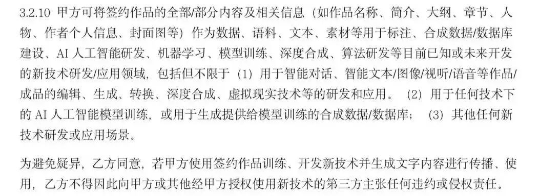 所谓的“AI训练补充协议”,即2023年底起番茄小说陆续在签约作品合作协议中新增的3.2.10条款。其中提到:“甲方(番茄小说)可将签约作品的全部/部分内容及相关信息(如作品名称、简介、大纲、章节、人物、作者个人信息、封面图等)作为数据、语料、文本、素材等用于标注、合成数据/数据库建设、AI人工智能研发、机器学习、模型训练、深度合成、算法研发等目前已知或未来开发的新技术研发/应用领域。”今年7月上旬,多位作者在社交平台反馈,收到了番茄小说发送的“AI训练补充协议”签署提醒。但这并不是面向所有作者,2020年开始在番茄小说发布作品的林静就始终没有收到相关消息,甚至有作者发帖称,是在事态发酵后查找自己曾经签署的合同,才发现已经被添加了这一条款——番茄小说的签约对象为作品,由于都是名为“2021分成”的制式合同,多数作者在再次签约时,并不会仔细翻看,只是按照惯性提交。