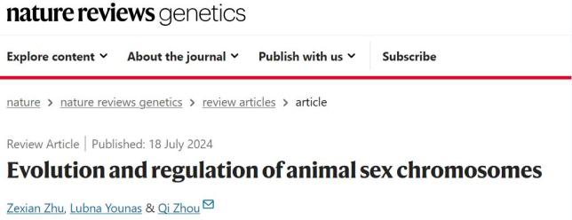 2024年7月18日,浙江大学周琦实验室受邀在Nature Reviews Genetics杂志撰写题为Evolution and regulation of animal sex chromosomes的综述文章。这篇文章通过总结一系列最新周琦实验室和其他国内国际同行的研究成果,深入探讨了动物性染色体独特的演化调控模式,为了解性别这一普遍存在的生物学现象背后复杂的多样性产生的原因提供了详细解读。