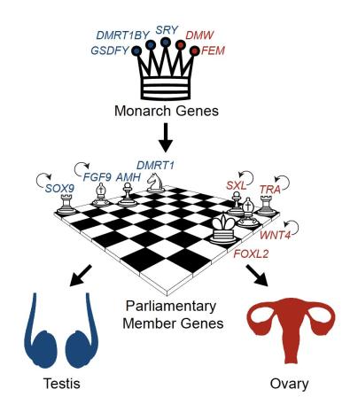 性别决定基因在物种间频繁的颠换也是造成性染色体系统多样性的原因之一,本文进一步讨论了这一现象背后的潜在机制。之前鲜有研究将性染色体的快速演化与上游性别决定基因(即所谓的“主效性别决定基因”, master sex determining gene)在胚胎发育时期短暂的表达窗口相联系。尽管这些基因在性别决定过程中起到了重要作用,但它们的表达往往不如下游基因那样持久,在演化和发育过程中都转瞬即逝。本文由此将这种机制类比于英国君主立宪制。所谓看起来很重要的“主效性别决定基因”(例如决定人类男性的 Sry 基因),像英国女王一样,实际上并不具备决定性的能力,只是在性腺发育过程中破坏了雌雄性腺发育之间微妙的平衡。相反,下游大量保守的涉及性腺发育途径的基因(即发育成雌性的卵巢还是雄性的睾丸)则通过形成类似于“议会”式的模式互相对抗,这些基因才是真正决定性别分化命运的力量。通过这种类比,本文理清了性别决定过程中的复杂性和多样性。最后,本文详细探讨了性染色体全局剂量补偿效应的机制。在Y染色体失去大部分基因后,物种需要发展出新的机制来平衡剂量效应。不同物种在三维核空间内通过不同机制实现这一平衡,这进一步展示了性染色体演化的多样性和复杂性。本文总结了当前领域的研究进展,为理解性染色体的演化和调控提供了新的视角。