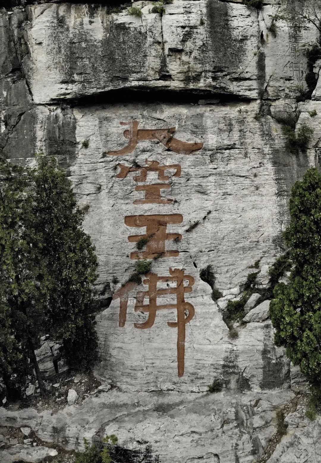 “大空王佛”石刻,564 年,通高 9.3 米,山东东平县洪顶山。峄山主峰五华峰附近尚存与洪顶山所见相同的《文殊般若经》片段,徂徕山顶名曰“映佛岩”的岩壁呈现来自《文殊般若经》的段落,水牛山山顶的一条狭窄小道旁也分布着石刻《文殊般若经》段落。