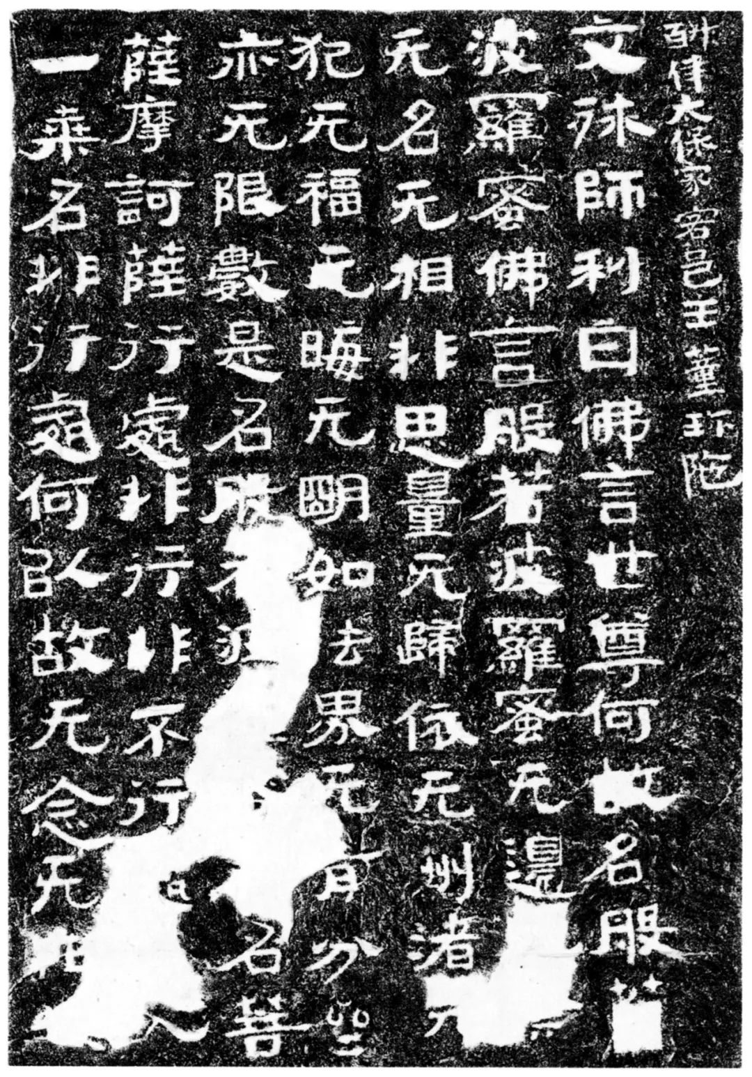 《文殊般若经》片段,约564年,拓本,3.8米 ×2.6米,原刻位于山东邹城市峄山。尖山一处岩坡及相邻的巨石表面刻着《文殊般若经》《大品般若经》选段和“大空王佛”这一单字高1.75米的佛名。葛山一处面西的花岗岩斜坡上有《维摩诘经》第十二品《见阿闷佛》中的200余字。