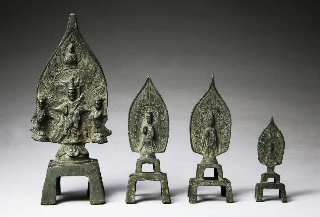 佛和菩萨像,青铜,山东邹城市观音寺遗址出土,邹城博物馆藏,自左及右:约533年;556年;562年。武帝对佛教的短暂打击是种不祥之兆,这意味着北方中国佛教徒所担忧的更糟糕的情形——佛教处在末法时代,可能正在接近彻底灭绝。对宗教末日即将到来的焦虑似乎与佛教本身一样古老。释迦牟尼告诫他的追随者,他的教诲只能在其去世后五百年内以其本真面目传播。