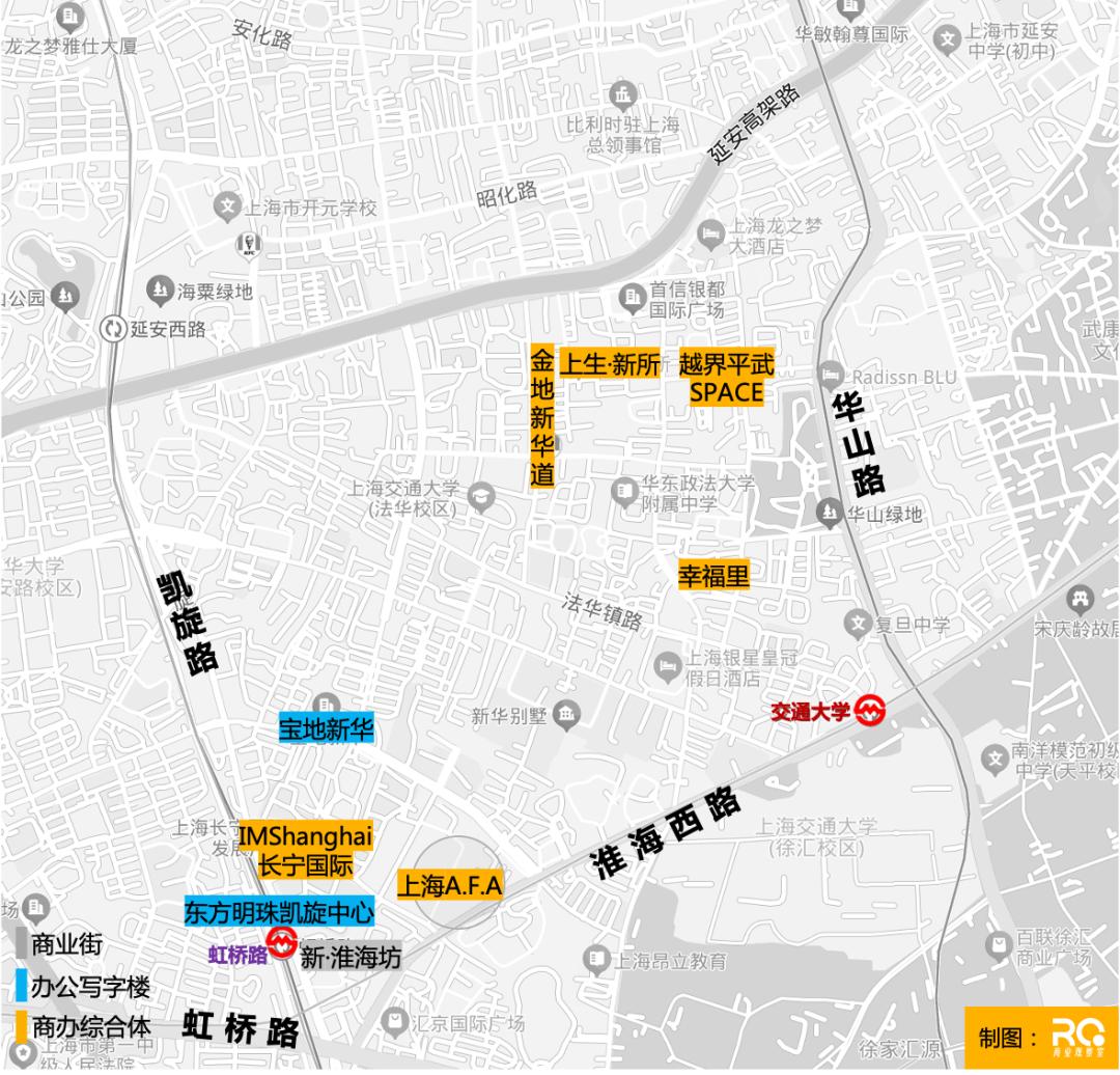又因处在长宁、徐汇两区交界地带,既能汲取两区的文化基因,也具备吸引两区人流的优势。从北向南看去,除常规的沿街商铺和商业街新·淮海坊外,已经生长出了上生·新所、金地新华道、越界平武SPACE和幸福里在内的小体量商业,同时也有大型商办中心——IMShanghai长宁国际和上海A.F.A,以及宝地新华和东方明珠凯旋中心在内的现代化写字楼。