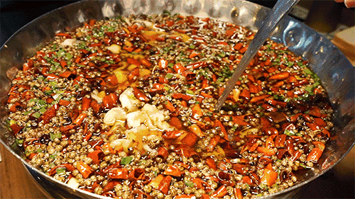 豆芽、莴笋、芹菜在椒香和辣香中浮沉,四方伸出的长筷比拼着追逐风味的速度。一桌桌食客们吃得撸起袖子、红光满面,爽朗的笑声与酒杯声共奏一曲,周遭都是快乐的空气。