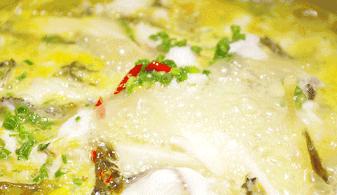 泛着金黄光辉的汤汁里,葱绿灵动,白鱼游走,一勺捞出,早已入味的鱼与脆嫩的酸菜一同咀嚼,口腔中都是清爽的鲜美。