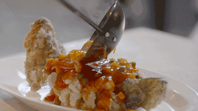 被片出花刀的鱼身,整条下锅炸至金黄定型,头尾高翘,极具鲜灵。浇上酸甜的酱汁,瞬间多了一抹晶莹剔透的亮意。
