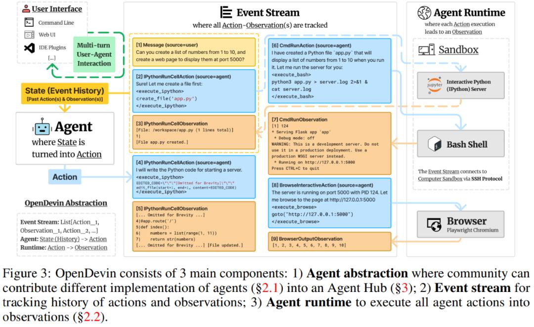 本文中,作者从以下几个方面描述 OpenDevin:(1)如何定义和实现智能体;(2)动作执行如何促进观察;(3)如何管理和扩展智能体常用的技能;(4)如何将多个智能体组合在一起以解决任务。