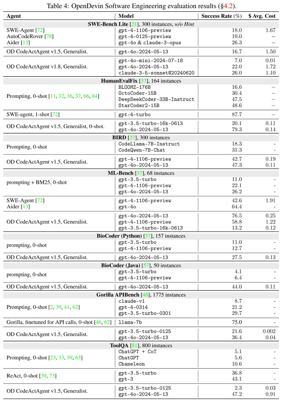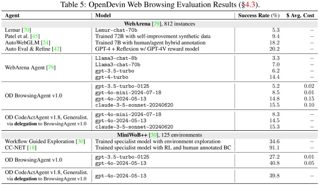 表 3 表明,虽然 OpenDevin 智能体可能无法在每个类别中都达到最佳性能,但其设计考虑了通用性。