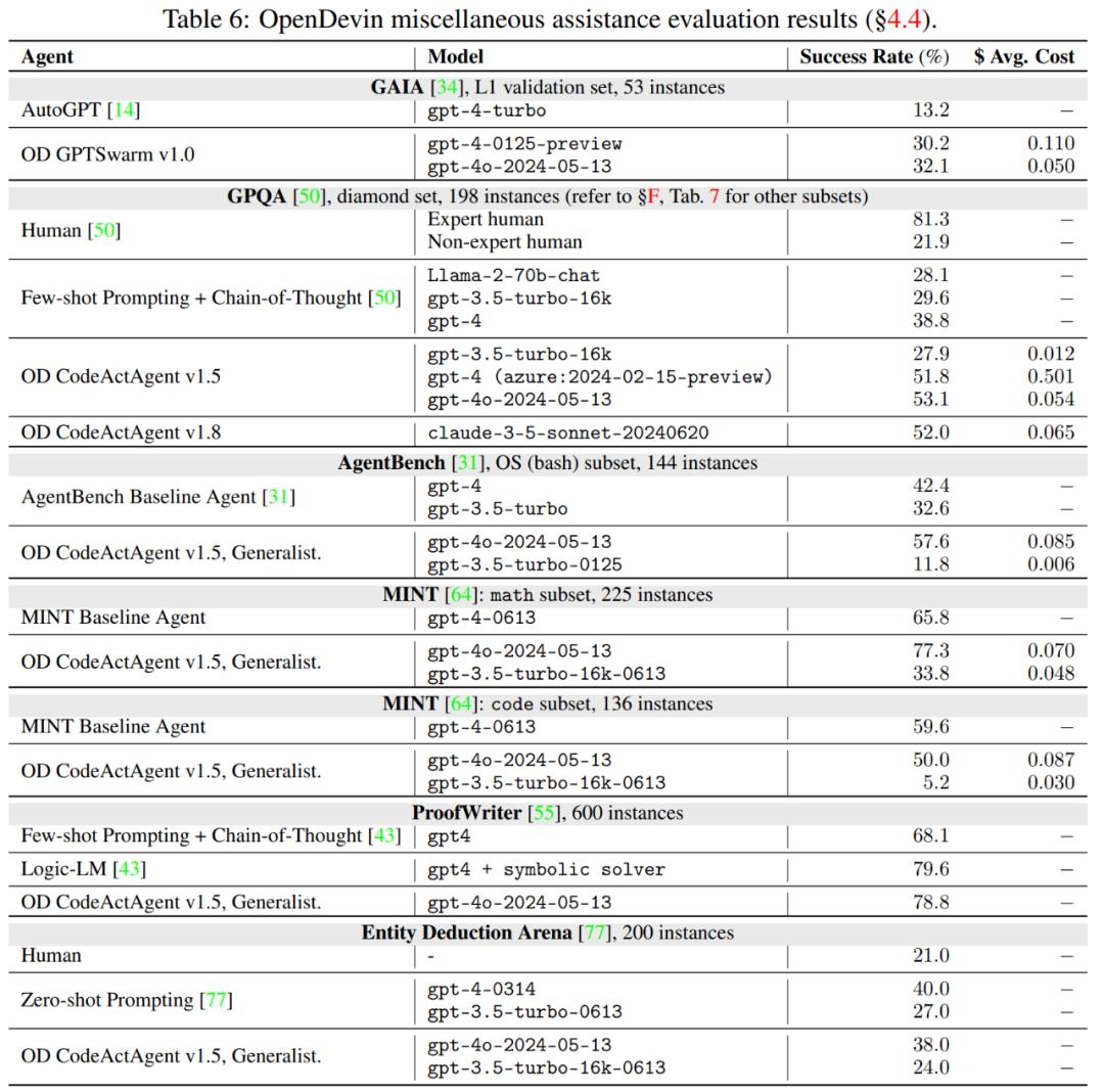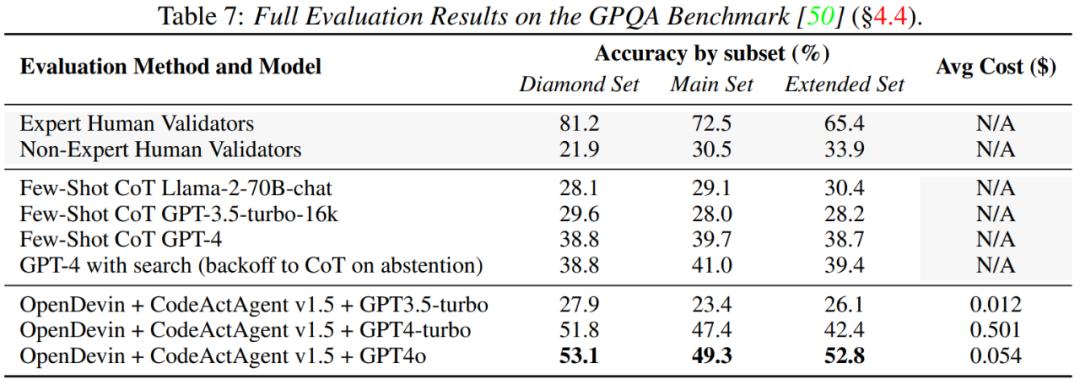 其中,GAIA 用于评估智能体解决一般任务的能力,结果显示,智能体在 GAIA 上取得了 32.1 分,比原来的 AutoGPT 有了明显的提高。GPQA 用于评估智能体在解决具有挑战性的研究生水平问题时协调使用工具的能力。结果如表 6、7 所示,OpenDevin 集成了支持多种工具使用以及 web 搜索的功能,使得智能体能够更好地解决复杂的多步骤问题。