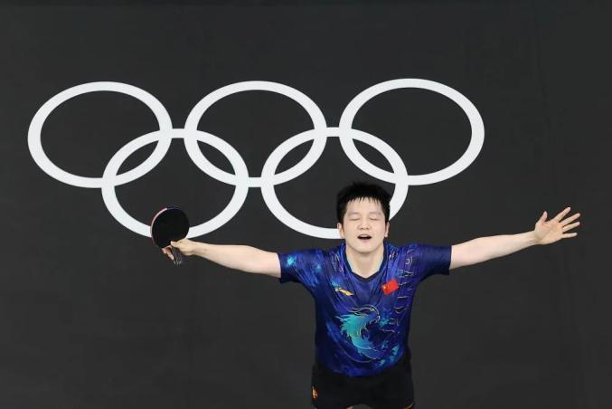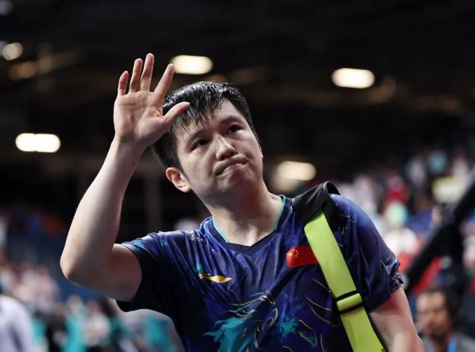 8月1日,樊振东赛后向观众致意。当日,在巴黎奥运会乒乓球男单四分之一决赛中,中国选手樊振东4比3战胜日本选手张本智和,晋级四强。新华社记者 王东震 摄比赛来到决胜局,比分来到10比7,樊振东的赛点。