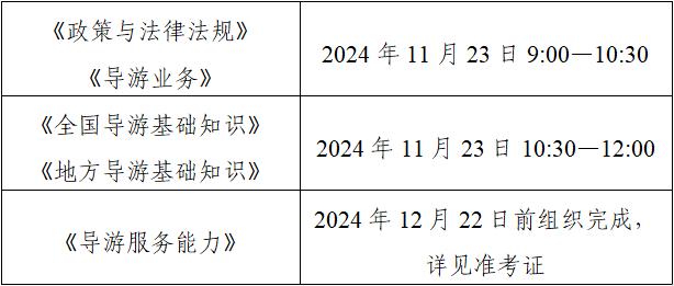 根据《文化和旅游部办公厅关于组织实施2024年全国导游资格考试的通知》要求,2024年全国导游资格考试(湖北考区)将于2024年11月23日(周六)举行笔试(面试时间详见准考证)。现将有关事项通知如下: