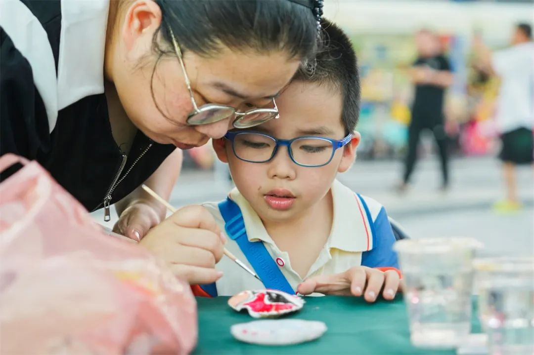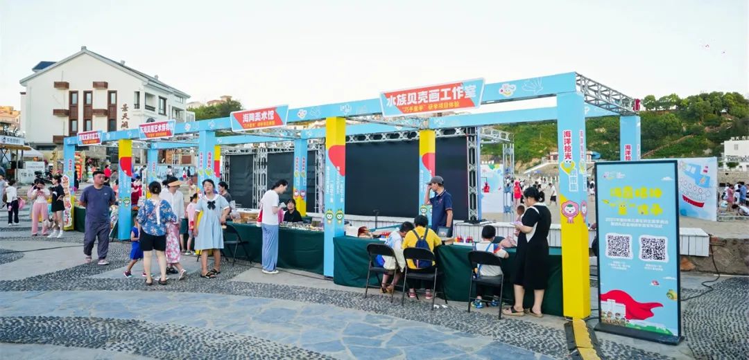 蘸海文旅共富工坊、东海贝雕艺术博物馆、海窑艺术中心、水族贝壳画工作室四家研学基地入驻现场,孩子们现场体验洞头特色鱼灯、贝雕、海陶、蟹壳画非遗技艺!
