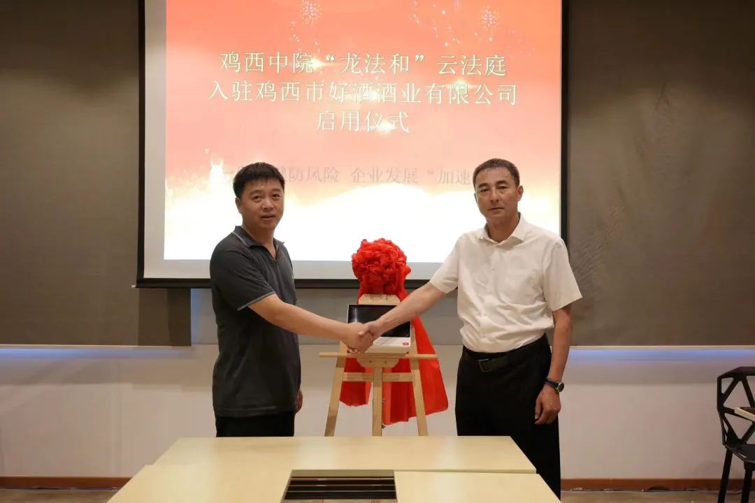 鸡西中院党组成员、副院长刘景峰与鸡西市好酒酒业有限公司董事长王运森共同为“龙法和”云法庭启用揭牌。梨树白白酒是鸡西市梨树区的重点企业,龙江老字号,省级非物质文化遗产,在鸡西地区享有盛誉,“近些年,我们不断拓宽市场,远销省内外,随之而来的跨地区纠纷也越来越多,鸡西中院不仅将龙法和’云法庭入驻到我们企业,还为我们配备专属的驻联法官,让我们在自己家就能解决纠纷,感谢鸡西法院。”王运森如是说。启用仪式后,鸡西中院开展了“龙法和”云法庭进企业专业培训,详细讲解了当企业遇到矛盾纠纷时,如何使用“龙法和”小程序化解纠纷,并解答了企业工作人员的法律困惑。