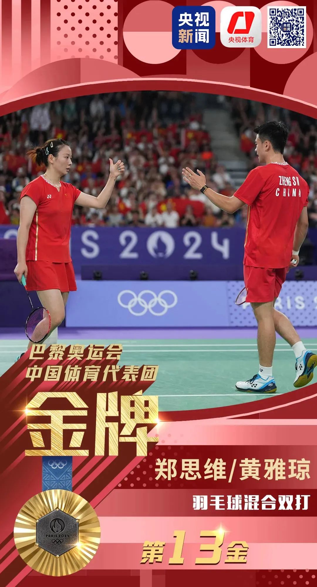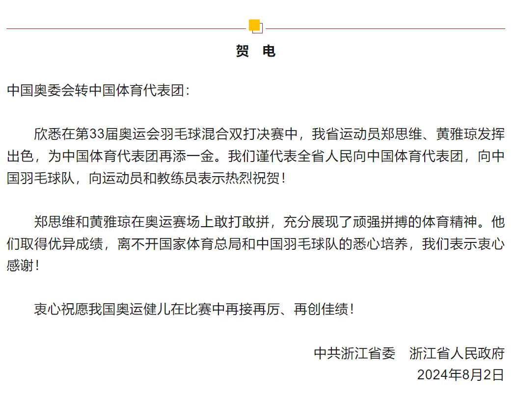 在第33届奥运会羽毛球混合双打决赛中,浙江运动员郑思维、黄雅琼为中国体育代表团再添一金。