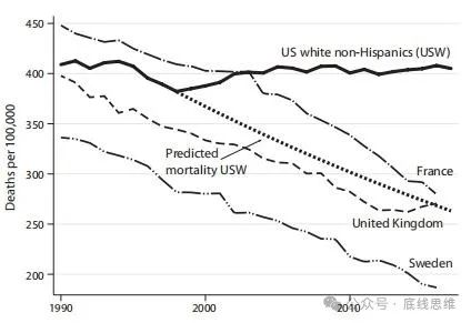 美国非西班牙语裔白人(粗黑线)在45-54岁的死亡率,并没有像法国、英国和瑞典那样下降。作者测算有趣的是,同样的药物在欧洲也有,但并没有引起大规模的死亡,原因是欧洲的监管机构不允许公众滥用这些药物。