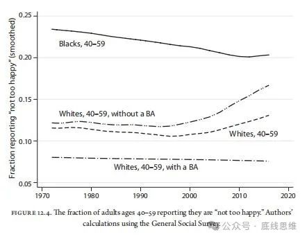 40-59岁美国成年人中自我报告“不太幸福”的人口比例,上图显示,没有本科学位的白人群体不幸福比例在2000年之后大幅上升(第二根虚线)。作者测算但在过去几年里,大学入学人数并没有大幅增加。事实上,只有大约38%的美国人拥有大学学位。