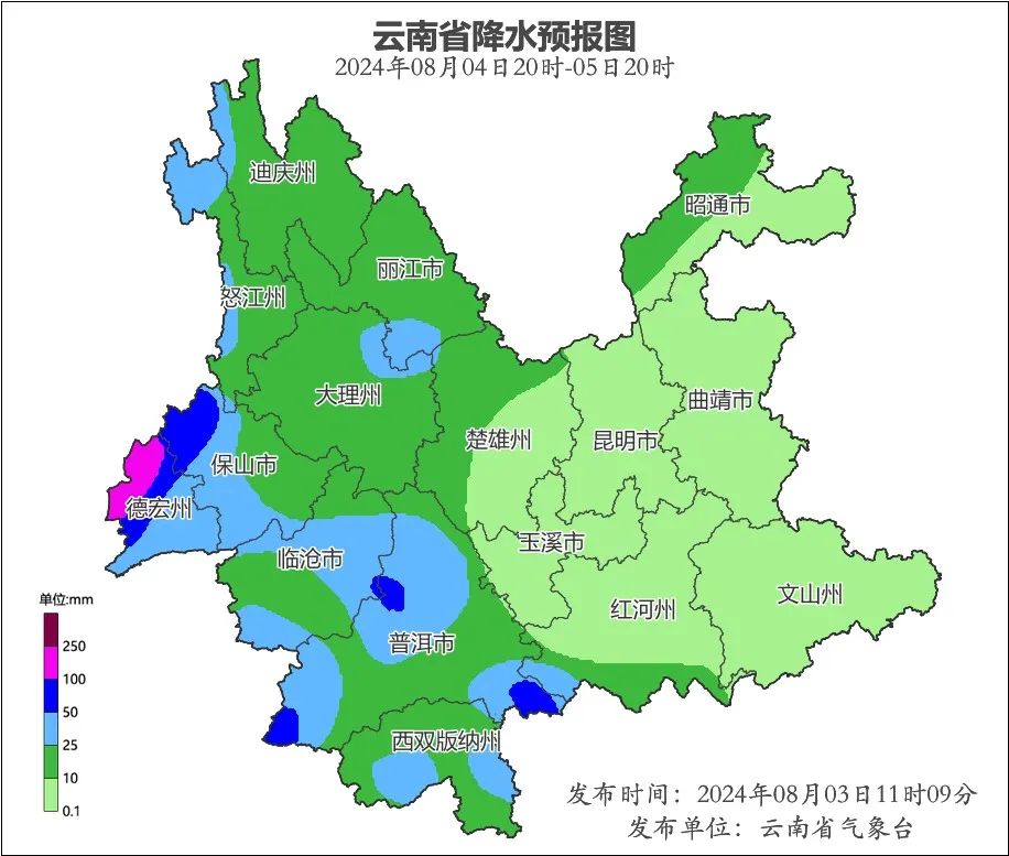 德宏州、保山市、临沧市、普洱市、西双版纳州阴有中到大雨局部暴雨、大暴雨,迪庆州、怒江州、丽江市、大理州、楚雄州西部、红河州南部、昭通市西部阴天间多云有小到中雨局部大雨,其他地区多云有阵雨。8月5日20时到8月6日20时: