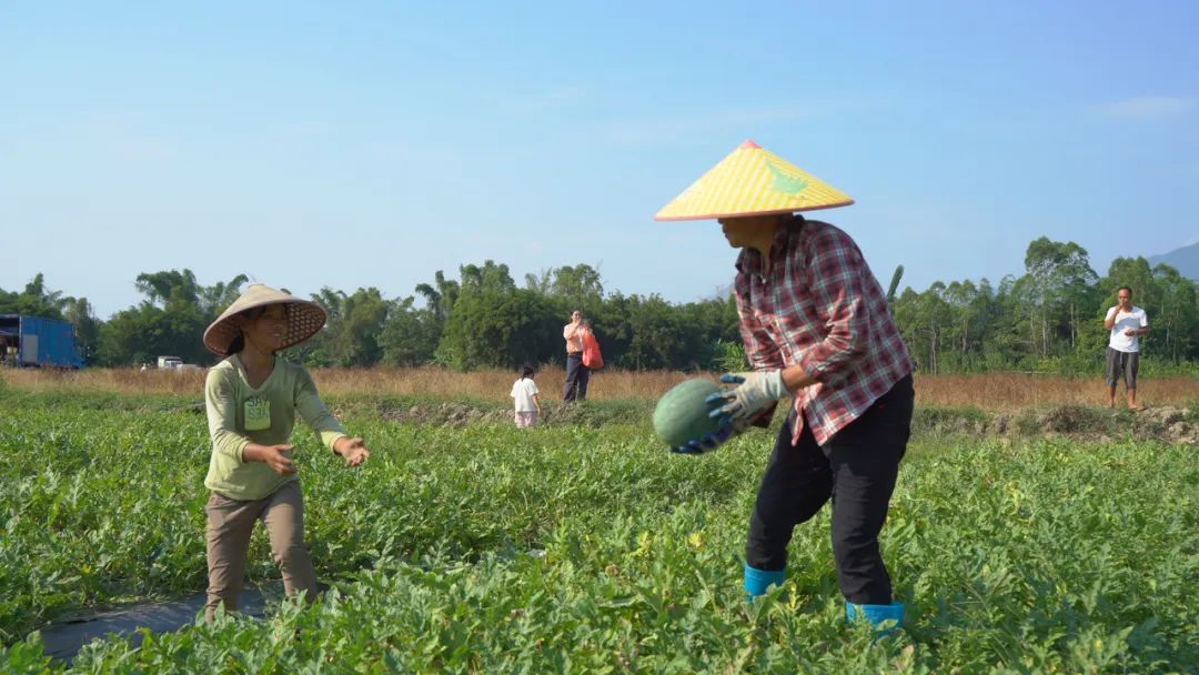 瓜农们头戴草帽,