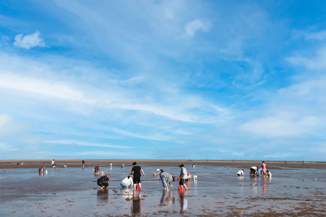 赶海人拿着小铲子、提着网兜、拎着小桶,捡拾竹蛏、蛤蜊、螃蟹、小海星……每一个收获都是惊喜。