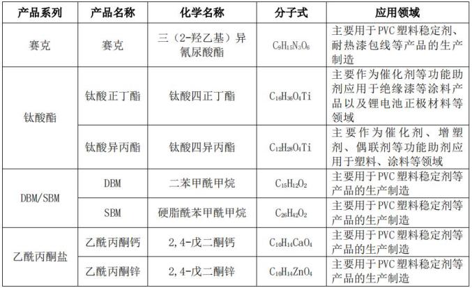 在钛酸酯领域,公司产品已作为催化剂、增塑剂、偶联剂等多种功能助剂广泛应用于塑料、涂料和锂电材料等行业,积累了艾伦塔斯集团、埃塞克斯集团等漆包线及绝缘漆行业的国际集团,联成化科、元利科技等增塑剂行业的上市公司,以及富临精工等国内知名的锂电池正极材料企业等客户资源。