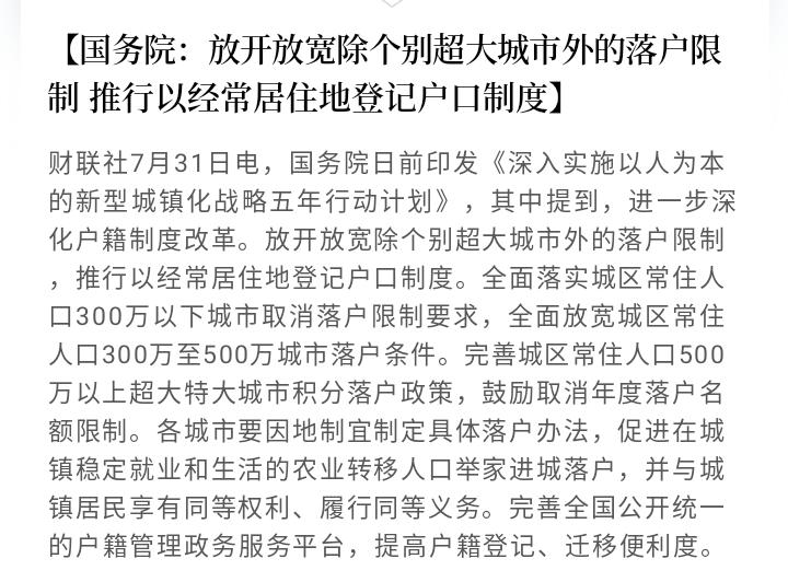 日前,国家层面印发新型城镇化战略五年行动计划,放开放宽除个别超大城市外的落户限制。