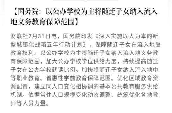 此前重要会议“改革决定”指出,推行由常住地登记户口提供基本公共服务制度,推动符合条件的农业转移人口社会保险、住房保障、随迁子女义务教育等享有同迁入地户籍人口同等权利。