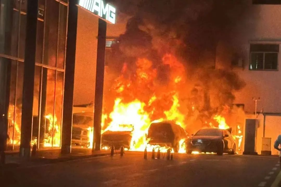 惋惜!一奔驰4S店外多辆车葬身火海!