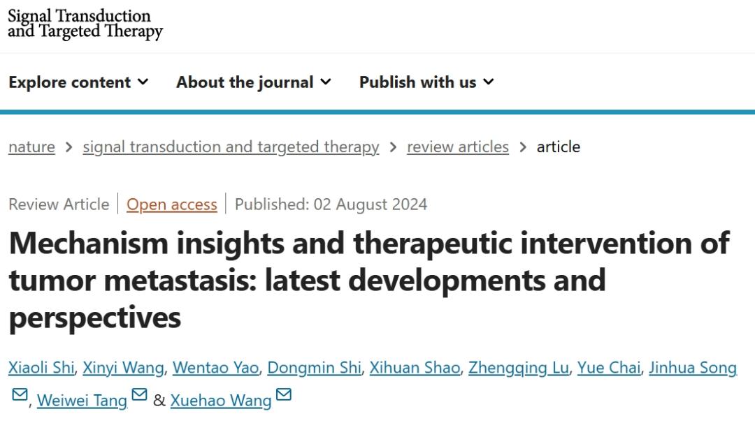 2024年8月2日,南京医科大学第一附属医院王学浩院士团队在期刊《Signal Transduction and Targeted Therapy 》上发表了题为“Mechanism insights and therapeutic intervention of tumor metastasis: latest developments and perspectives”的研究论文。在这篇综述中,团队从各个角度描绘了肿瘤转移的遗传转变和前瞻性治疗干预措施。随着科学界向临床实施的进展,当务之急是不要将注意力仅仅集中在肿瘤上,而是要纳入全面的患者评估。