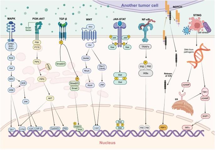 与肿瘤转移相关的经典信号通路。其中,MAPK、PI3K-AKT、TGF-β、JAK-STAT是基于磷酸化的信号通路,被细胞外激活因子级联扩增到细胞中,最终进入下游核转录调控。Wnt和NF-κB信号通路是基于磷酸化和蛋白质泛素化降解的信号形式,也被广泛表达。Notch是一种蛋白质剪切依赖性信号转导模式。将STING通路与其他几种免疫信号机制区分开来的一个重要特征是,其激活是由DNA触发的,因此,缺乏病原体特异性。纳米技术